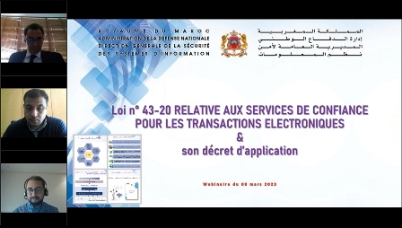 Suite à la publication au Bulletin Officiel du décret n° 2.22.687 pris pour l'application de la loi n° 43-20 relative aux services de confiance pour les transactions électroniques, et dans la continuité de ses actions de communication et de sensibilisation autour du cadre juridique régissant les services de confiance au Maroc, la Direction Générale de la Sécurité des Systèmes d’Information (DGSSI) a organisé le 08 mars 2023 un webinaire sous le thème "la loi n° 43-20 relative aux services de confiance pour les transactions électroniques et ses textes d'application".